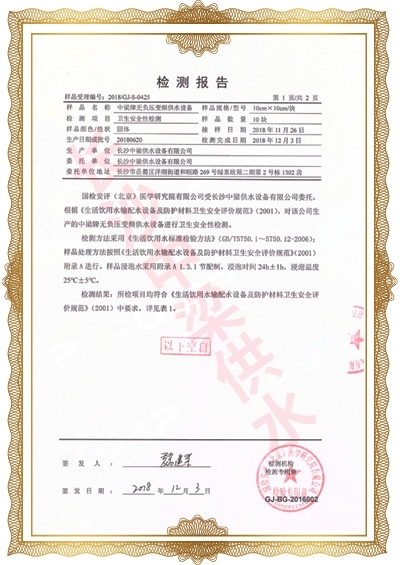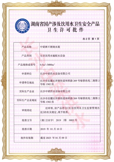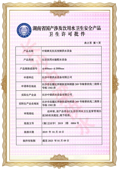 長(zhǎng)沙中梁供水設(shè)備有限公司已先后通過湖南省衛(wèi)生廳國(guó)產(chǎn)涉及飲用水衛(wèi)生產(chǎn)品衛(wèi)生許可批準(zhǔn);